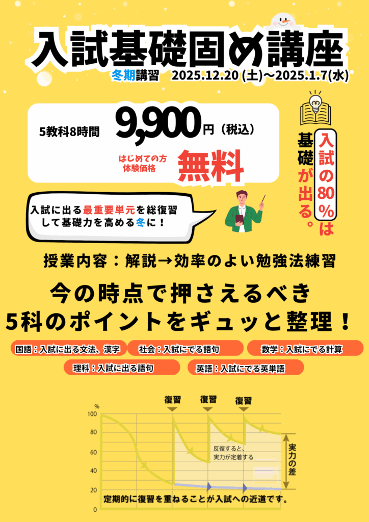 三重県入試の8割は、基本知識からの出題! だからこそ、中1・中2の段階から、重要語句を徹底的に復習します。冬の間に、ひと足はやく受験に向けた準備を始めましょう!