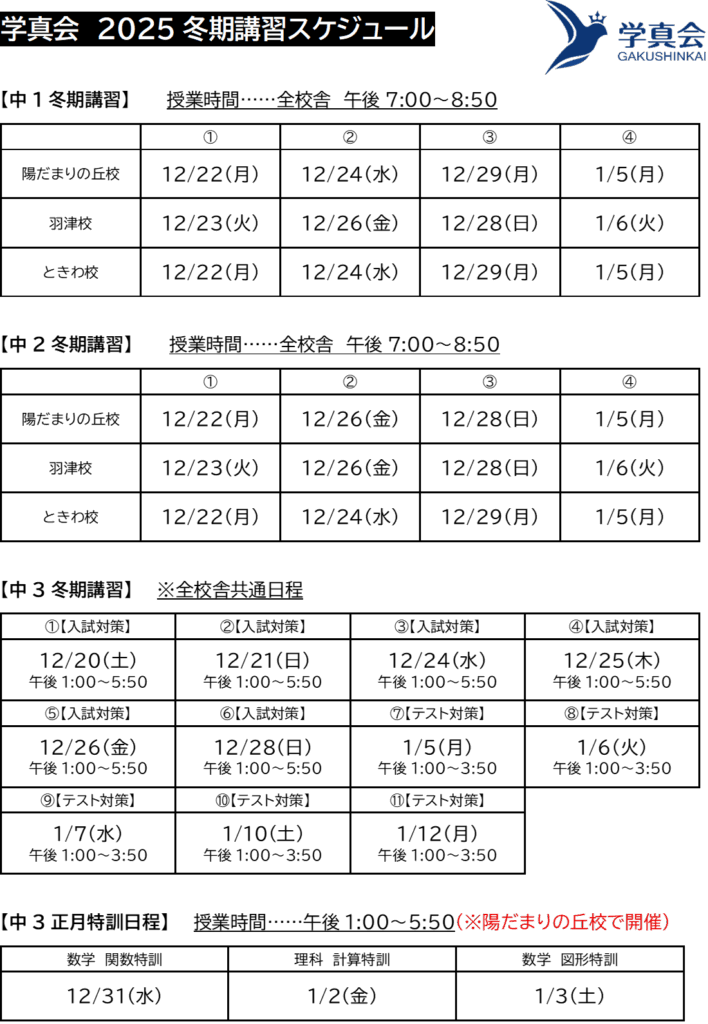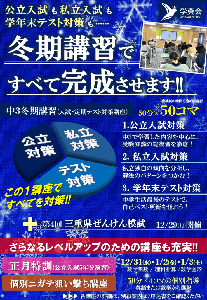 公立入試対策・私立入試対策・学年末テスト対策のすべてを、この冬期講習に集約しました。志望校合格に向けて、確かな実力を身に付けます。